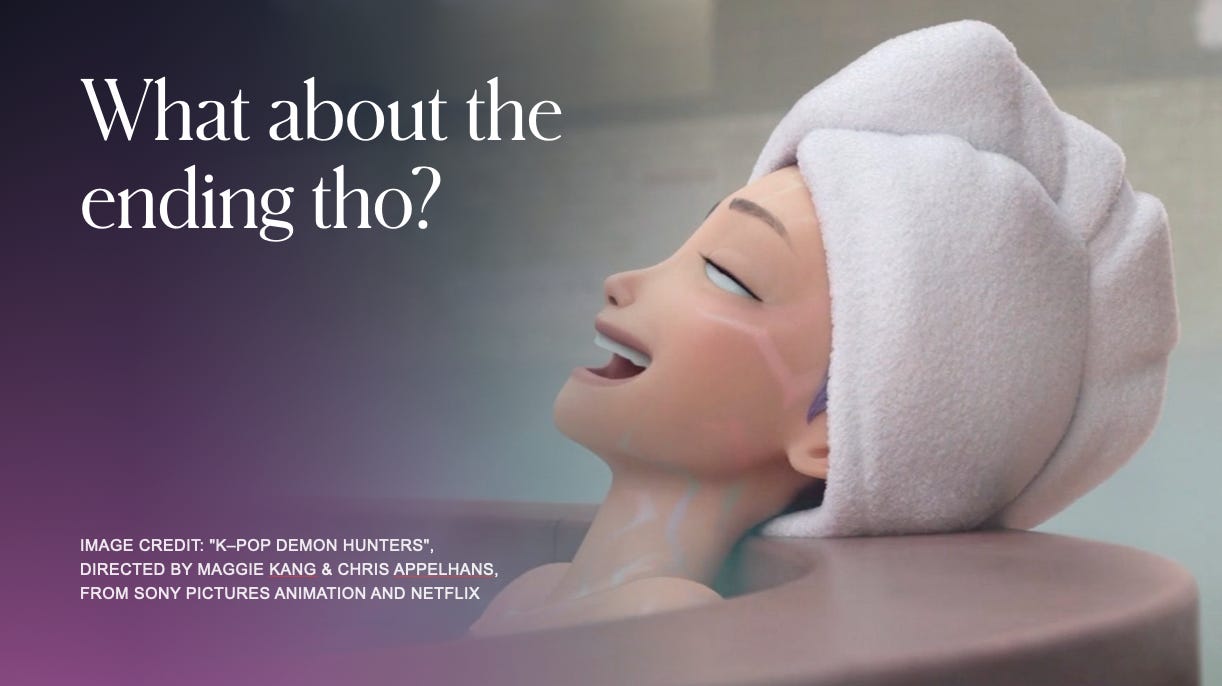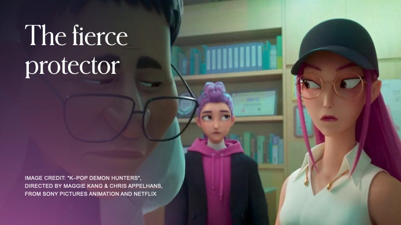 This is the story of a demon hunter battling dark forces in a bid to save the world from destruction, and reckoning with her own demon nature in the process. For me, the most fascinating and useful thing about the psychodrama presented by K-Pop Demon Hunters is what this film reveals about how we use other people’s adoration to fuel self-elimination, and how shame doesn’t always look like darkness, but rather productivity and the pursuit of success. K-Pop Demon Hunters is about the walls we build to protect ourselves, but that often turn out to be the very things that will destroy us.