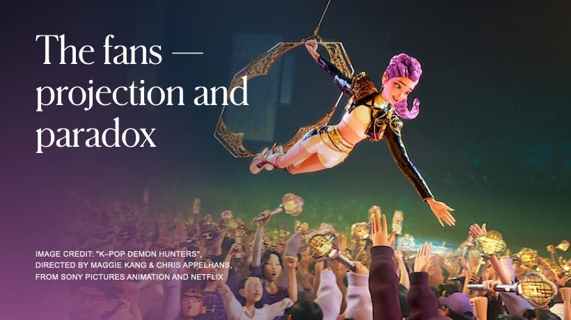 So here’s the question: have these parts actually integrated, or did they just survive one crisis before reverting to the same pattern? They defeated Gwi-Ma’s voice and transformed the barrier, but they’re still trapped by the same performance imperative, no? The fans are still there, their projection is still externalised, and the moment adoration calls, they choose it over the rest they’ve been wishing for throughout the movie.