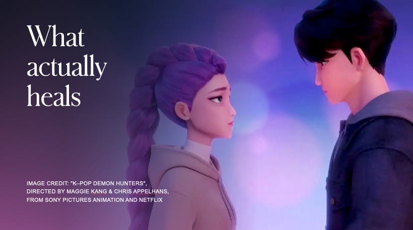 In what ways do you perform perfection? Where are you hiding parts of yourself to be acceptable? What gets locked behind your personal Honmoon because you’ve decided it’s too messy, too ugly, too much? Your gold barrier might look like productivity, politeness, or never showing weakness. It’ll be different for each of us, but its effect is the same: it fragments rather than protects.